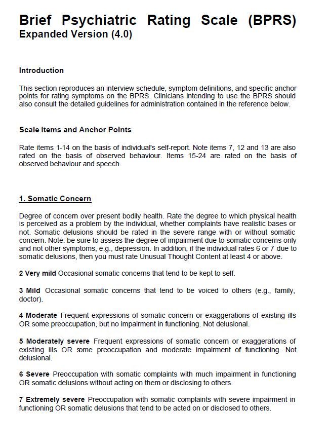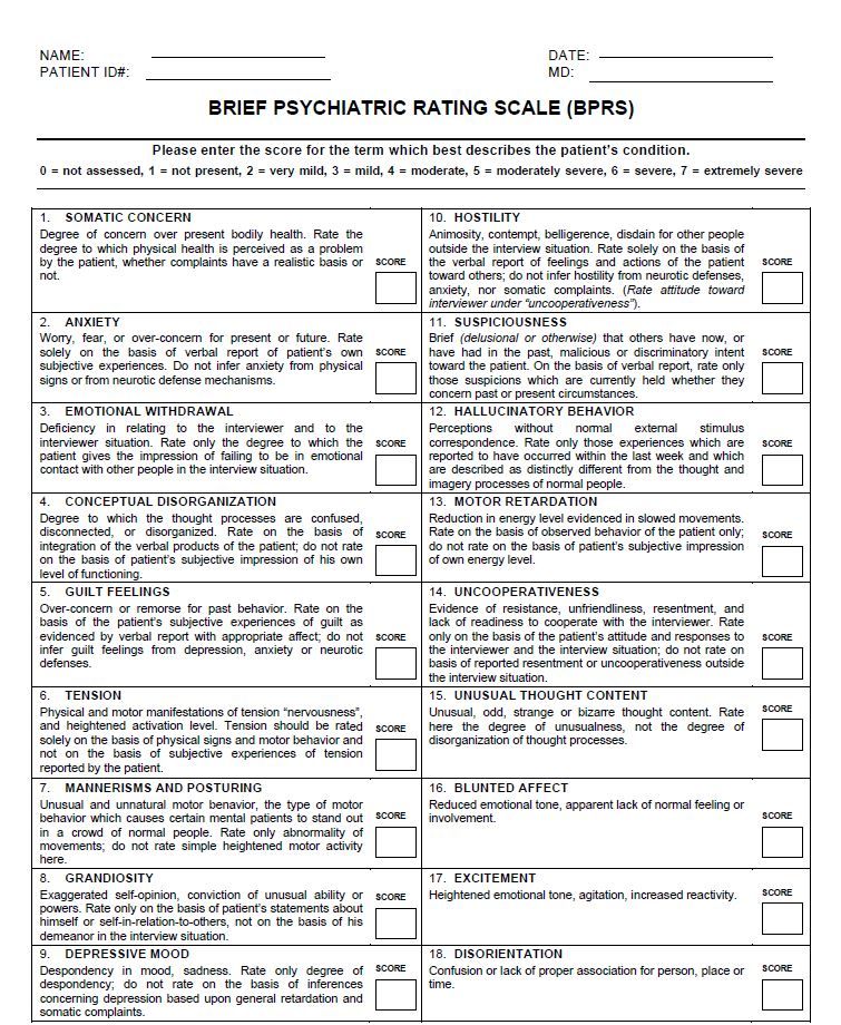 Persons having or suspected of having schizophrenia or other psychotic disorder manifest the disorder in multiple ways. The BPRS assesses the level of 18 symptom constructs such as hostility, suspiciousness, hallucination, and grandiosity. It is particularly useful in gauging the efficacy of treatment in patients who have moderate to severe psychoses.